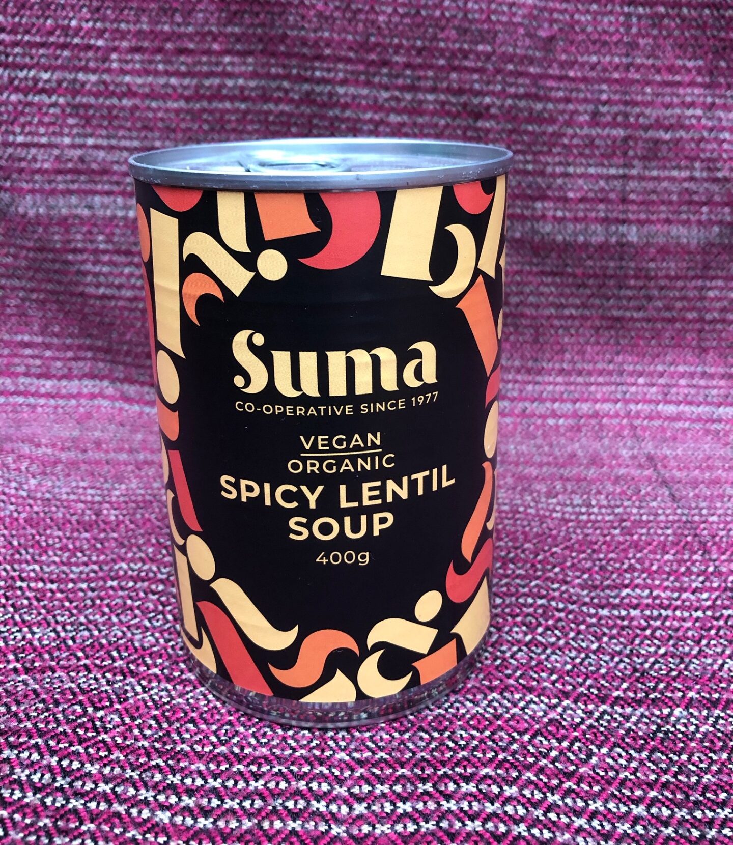 A tin of organic vegan spicy lentil soup from Suma.