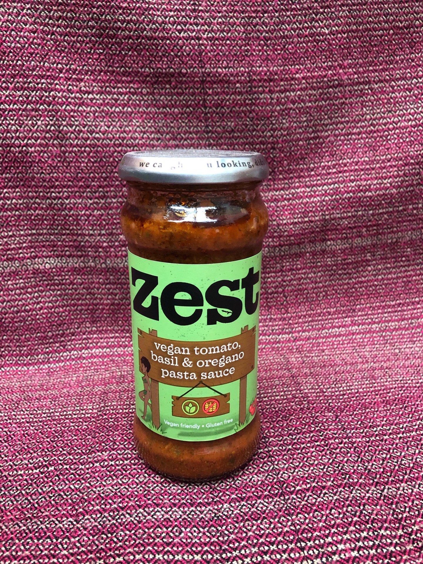 A jar of vegan pasta sauce with tomato, basil & oregano made by Zest.